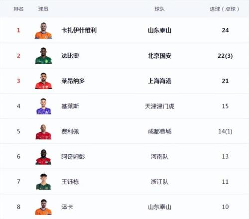 射手榜上,山东泰山前锋卡扎伊什维利在与上海海港的比赛中独中两元,以24球继续领跑。北京国安的法比奥本轮打进一球,以22球继续紧追卡扎伊什维利。上海海港的莱昂纳多本轮无有建树,终结了近期4场8球的良好势头,以21球位列第三。助攻榜上排在第一的是河南队的纳萨里奥,他已送出9次助攻,但其身后有8次助攻的多达4人,分别是韦世豪、维塔尔、泽卡和高天意,助攻王的争夺更为激烈。