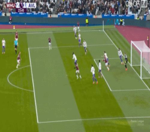 第24分钟,波茨助攻,鲍恩门前点射破门,西汉姆联2-1维拉